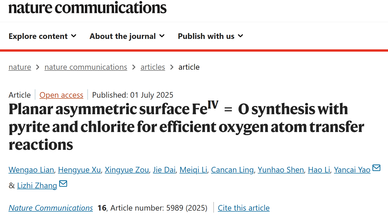 近日,伟德bevictor中文网页张礼知教授团队在自然•通讯《Nature Communications》在线发表了题为“Planar asymmetric surface FeIV=O synthesis with pyrite and chlorite for efficient oxygen atom transfer reactions”的研究成果。该研究发现亚氯酸根和黄铁矿反应能生成构型为Fe-Cl1S3的平面非对称表面高价铁-氧物种,该物种具备电子离域和铁氧键弱化特征,可提升氧转移反应效率。论文第一作者为伟德bevictor中文网页2024级直博生连文高和2021级致远荣誉计划博士生邹幸玥,通讯作者为伟德bevictor中文网页么艳彩副教授和张礼知教授,第一完成和通讯单位均为伟德bevictor中文网页。
