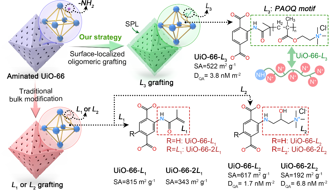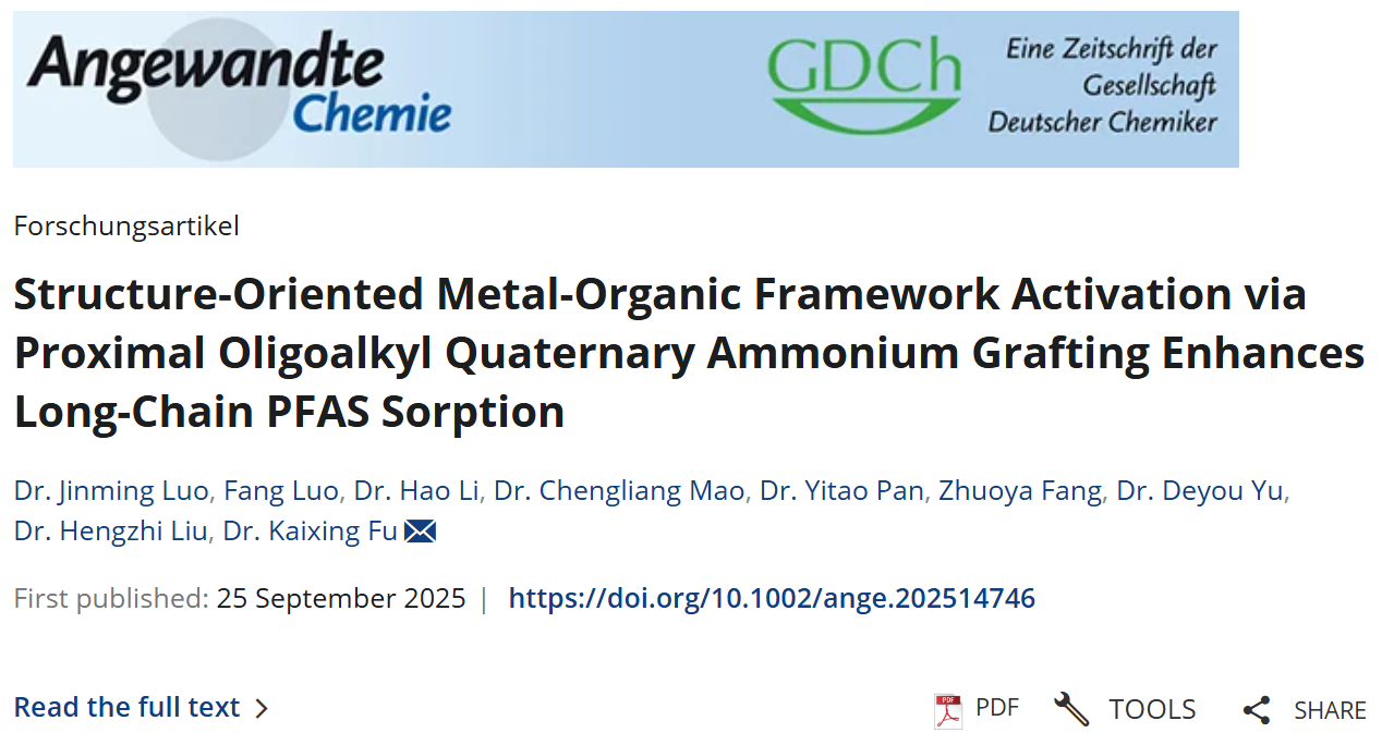 近日,伟德bevictor中文网页罗金明副研究员在《德国应用化学》(Angewandte Chemie)上发表了题为“Structure-Oriented Metal-Organic Framework Activation via Proximal Oligoalkyl Quaternary Ammonium Grafting Enhances Long-Chain PFAS Sorption”的研究成果。该研究成果突破传统MOF修饰局限,提出了一种表面局域化寡聚枝接策略,在UiO-66-NH₂表面精准构筑了邻近排列的寡聚烷基季铵盐(PAOQ)功能基元。该设计巧妙规避了MOF内部微孔的空间限制与传质壁垒,实现了功能基团负载量2.2倍的提升,并通过季铵盐与柔性烷基链的精确空间协同,实现了对长链PFAS的双模式高效捕获。