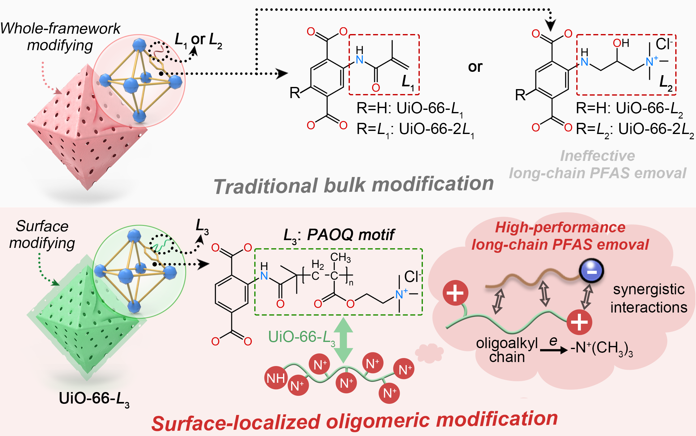 金属有机框架材料(MOF)因其比表面积大、结构可调,被广泛用于PFAS去除。然而,MOF材料微孔功能化受限、配位位点不足以及主客体相互作用力较弱,限制了其规模化应用。鉴于此,研究团队提出一种表面定位寡聚接枝新策略,在UiO-66-NH2骨架上构建近端排列的低聚烷基季铵(PAOQ)功能基元,成功开发出新型吸附材料UiO-66-L3。实验表明,UiO-66-L3具备快速吸附动力学(5分钟达到平衡)和高吸附容量(403–1872 mg·g⁻¹),性能优于常见季铵化材料13.3倍。理论模拟进一步揭示,低聚烷基链可增强相邻铵位点的静电势,赋予材料链长依赖性选择能力。该研究不仅展示了表面化学调控对Zr-MOF性能提升的关键作用,也为设计高性能PFAS吸附材料提供了新方向。