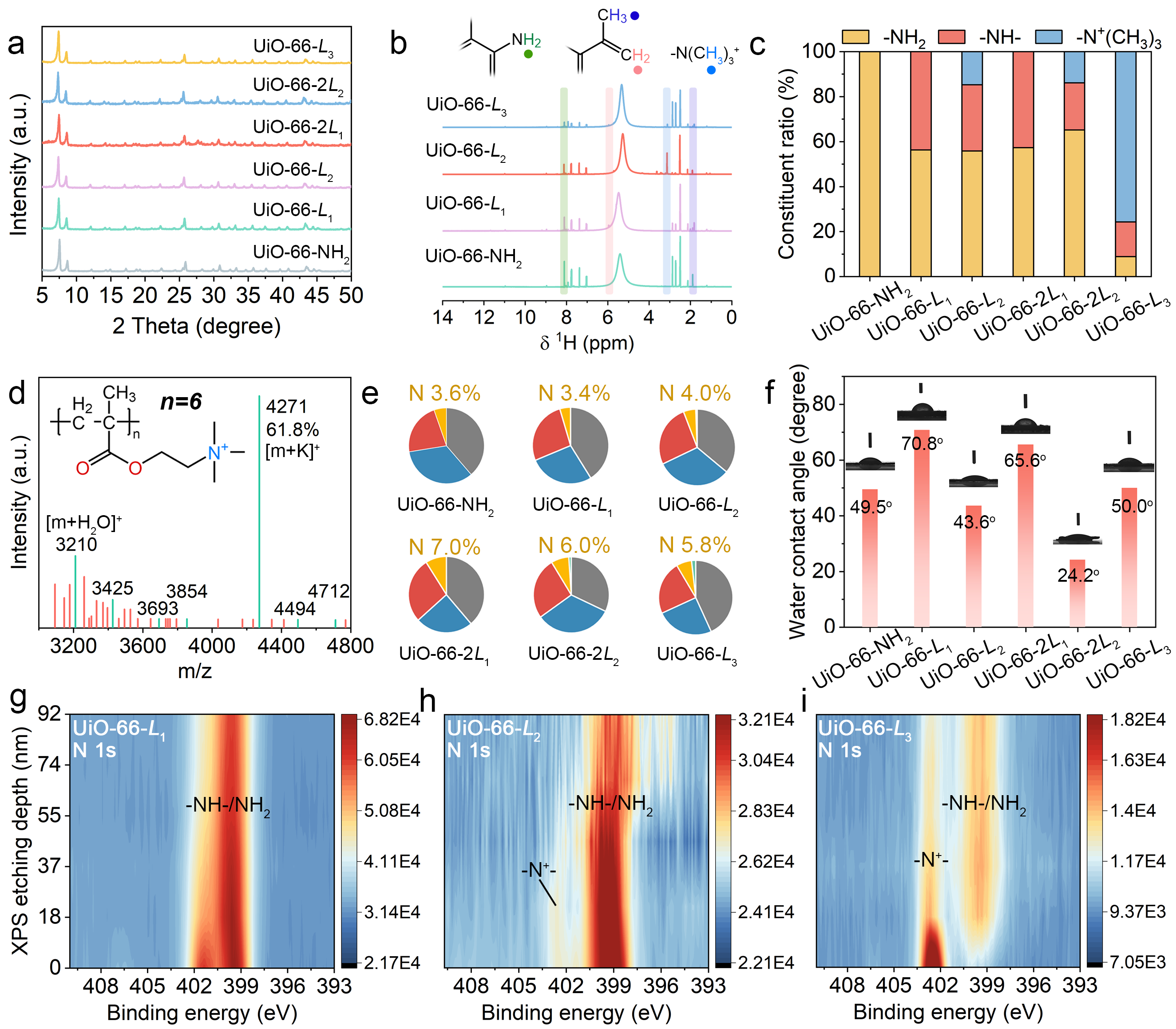 研究团队基于UiO-66-NH2材料的氨基可修饰性,通过三种不同修饰路径成功开发出多种高性能吸附剂变体。其中,采用表面定位寡聚接枝策略构建的UiO-66-L3材料,在保留母体材料晶体结构与八面体形貌的同时,实现了功能基团的高负载与均匀分布。该材料具备优异的热稳定性与化学稳定性,在220°C内结构稳定,并能耐受多种酸碱和有机溶剂。表征结果显示,改性过程中伯胺基团逐渐被取代,季铵基团成功接枝,材料化学成分可控,结构完整性保持良好。