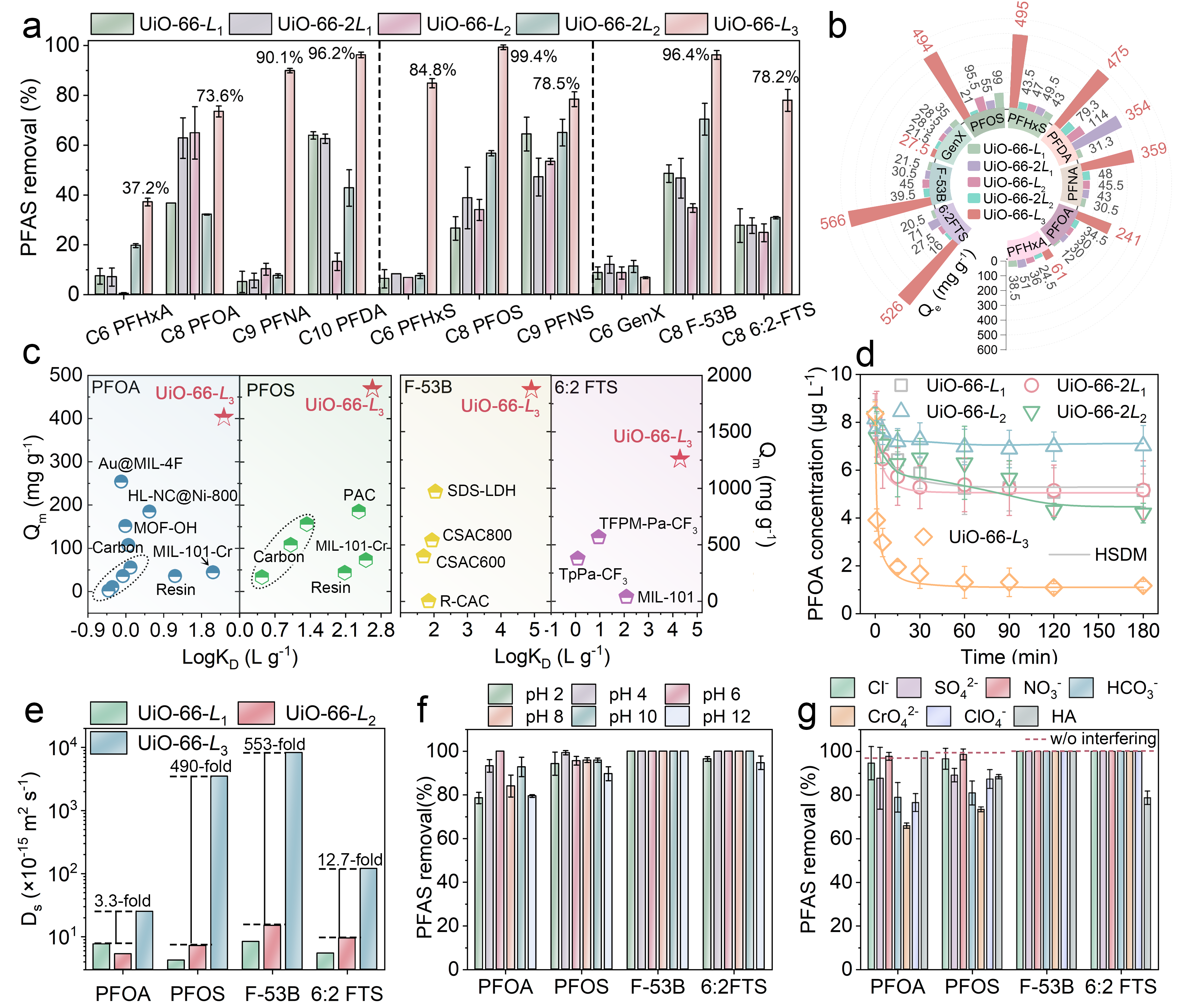 UiO-66-L₃对长链PFAS及其衍生物表现出卓越的吸附能力与动力学性能。实验表明,其对全氟辛酸(PFOA)、全氟辛烷磺酸(PFOS)及新兴污染物F-53B的吸附容量分别达402.7 mg·g⁻¹、469.2 mg·g⁻¹与1871.7 mg·g⁻¹,最高优于传统季铵化材料13.3倍。在真实湖水中,材料5分钟内即可达到吸附平衡,对多种长链PFAS的去除率稳定在77.8%–100%。即便在酸碱环境或共存阴离子干扰下,UiO-66-L₃仍保持高效去除能力,凸显其在实际应用中的潜力。