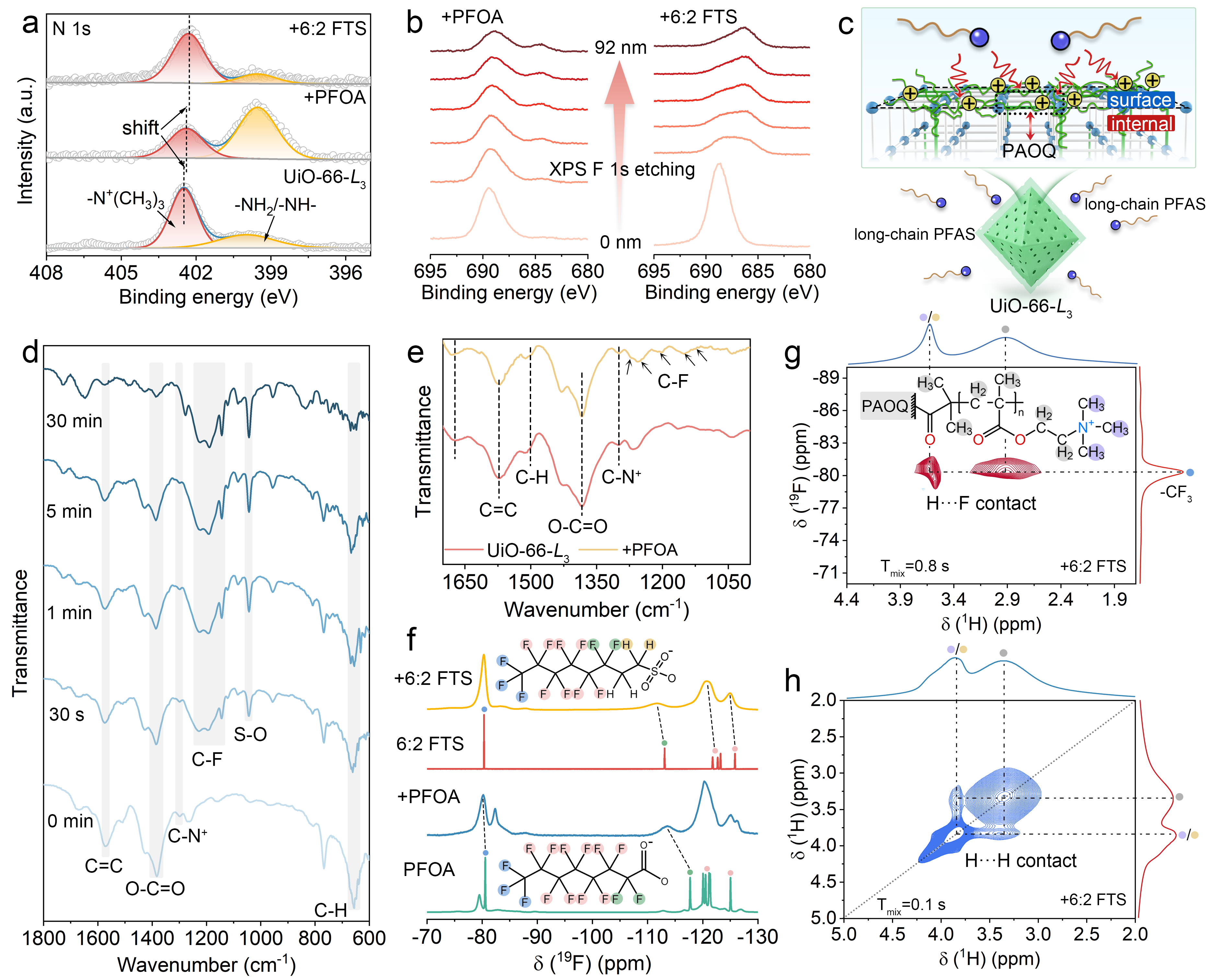 通过多种光谱联用技术,研究团队在分子层面揭示了PFAS的吸附机理。XPS分析显示PFAS吸附后季铵氮峰发生0.10-0.20 eV红移,证明其与阴离子头基的强静电作用。原位FTIR谱图中S-O与C-F特征峰的增强,以及PAOQ相关振动的衰减,直观反映了PFAS在材料表面的累积过程。二维NOESY谱进一步证实PAOQ中烷基质子与PFAS氟原子存在密切空间关联(H···F距离2.59-2.73 Å),而对于6:2 FTS的吸附更是通过–CH₂CH₂–段引发独特的C–H···H–C范德华作用,形成多层次吸附网络。
